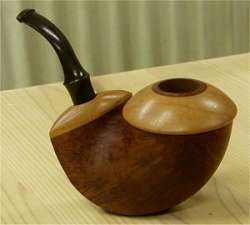 Schöne Ikebana Calabash mit abnehmbarem Einsatz (Buchs/Bruyere) Kurzinformation: Kei Gotoh hat lange Zeit in eigener Werkstatt für Tsuge Ikebana-Pfeifen angefertigt. Besonders 1981 entstanden eine ganze Reihe von Calabashes. Die Folgenden Bilder zeigen ein paar weitere Beispiele aus dieser Zeit, die das frühe Talent von Gotoh, damals erst Anfang 20, nachdrücklich bestätigen.