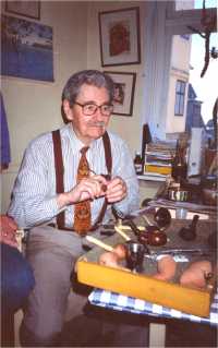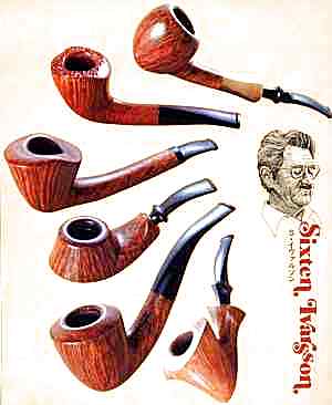 Sixten Ivarsson wurde 1910 in einer sehr armen Familie in Südschweden geboren. Sein Vater starb, als Sixten erst 8 Jahre alt war. Mitte der 30ger Jahre ging er mit seiner Frau, einer Dänin, nach Kopenhagen, wo sein Schwager eine kleine Firma betrieb, für die Sixten als Rechnungsvollstrecker arbeitete. Während und nach dem 2. Weltkrieg war es unmöglich neue Pfeifen bekommen, weshalb alte Pfeifen oft repariert wurden. In der Absicht, eine Pfeife reparieren zu lassen, kam Ivarsson zu einer Pfeifenreparaturwerkstatt (Suhrs) und führte, da der zuständige Handwerker krank war, die Reparatur selbst aus, sehr zur Freude des Inhabers, der Sixten auf der Stelle eine Tätigkeit anbot. Nach dem sich Ivarsson viele Fertigkeiten angeeignet hatte, begann er, zunächst auf Anfrage, selbst Pfeifen zu machen. Die Information verbreitete sich rasch, dass es bei Suhr möglich ist, neue Pfeifen zu bekommen, die sogar in einem anderem Design ausgeführt waren. Was ist das Besondere an den Pfeifen von Sixten Ivarsson in dieser Zeit und wodurch wirkte er, dessen Pfeifen uns heute so vertraut scheinen, über diese Zeit hinaus? Sixten fertigte Pfeifenköpfe aus „freier Hand“ und begann, mehr mit der Maserung und den Beizen zu experimentieren. Die Tatsache, dass die Pfeifen handgemacht waren, erlaubte ihm, die Kanteln zu drehen, um so die schönste Maserung vor dem Schneiden der Form zu bekommen. Ebenso konnte die Form der Pfeife während des Prozesses geändert werden, wenn ein Fehler im Holz auftauchte. Andererseits akzeptierte Sixten immer geringfügige Fehler im Bruyère, wenn sie unvermeidlich waren. Auch das Stehenlassen der Naturborke am Kopfrand geht auf Sixten Ivarsson zurück, ebenso die systematische Verwendung von Horn, Bein oder Bambus zur Holmverlängerung. Wenn wir heute derartige Elemente als zusätzliche „Zierde“ begreifen, hatte deren Einführung eigentlich Sparsamkeitsgründe. Es widersprach Ivarssons Naturell zutiefst, mit dem noch raren Holz verschwenderisch umzugehen. Diese Elemente sind, gemeinsam mit sehr typischen Kopfformen (Kibitz-Ei, Noferetete u.a.), das Markenzeichen von Sixten Ivarsson geworden. Sixten Ivarsson fertigte bis 1993/94 selbst Pfeifen an, zum Teil mit Hilfe von Sohn Lars und Enkelin Nanna. Er starb, hoch geachtet und verehrt im Frühjahr 2001. Die Pfeifen von Sixten sind gestempelt: „An Ivarsson Product“ (runder Stempel), im Inneren Jahresangaben. Die Preise der Pfeifen von Sixten Ivarsson (shape: "Peewit") lagen 1961/62 (Pipe Dan-Katalog) bei 100.- bis 150.- DKK für sandgestrahlte Exemplare, glatte kosteten 150.- bis 200.- DKK, Straight Grain gab es für 250.- bis 300.- DKK. Ausgefallene Formen (Oliphant, Ukulele) kosteten bis maximal 400.- DKK. Der Wechselkurse betrugen damals 6,82 Kronen für 1 US- $ bzw 1,68 Kronen für 1 DM. Die Pfeifen von Sixten Ivarsson gehören heute zu den begehrtesten Sammelobjekten überhaupt. Da Pfeifen von Sixten Ivarsson selbst immer als Rauchinstrumente angesehen wurden, gibt es, gerade aus den früheren Jahren, nur wenige wirklich gut erhaltene Stücke. Diese erzielen dann stattliche Preise zwischen 1800.- bis 3.200.- € und darüber hinaus, in Abhängigkeit vom Zustand und Form.