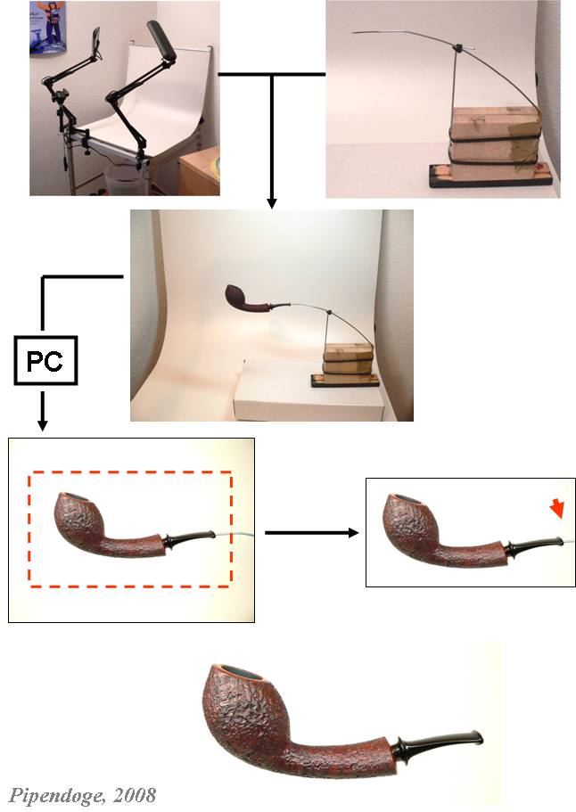 Ich werde manchmal auf die Präsentation meiner Pfeifen angesprochen und gefragt, wie ich die Bilder mache. Ich bin kein Foto-Enthusiast und mancher Profi mag bei den folgenden Schilderungen graue Haare bekommen. Nach langen unbefriedigenden Versuchen habe mir einen Fototisch bei einem on-line Auktionshaus gekauft. Dazu gehören zwei Lampen und ein Kamerastativ, welche mit dem Tisch sicher verbunden sind. Aus Restholz und einem Kleiderbügel aus der Reinigung habe ich mir eine Halterung für die Pfeifen gebastelt. Mein Ziel war es, die Pfeifen so darzustellen, als würden sie schweben. Nach der Aufnahme (Panasonic FZ 20) werden