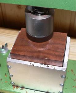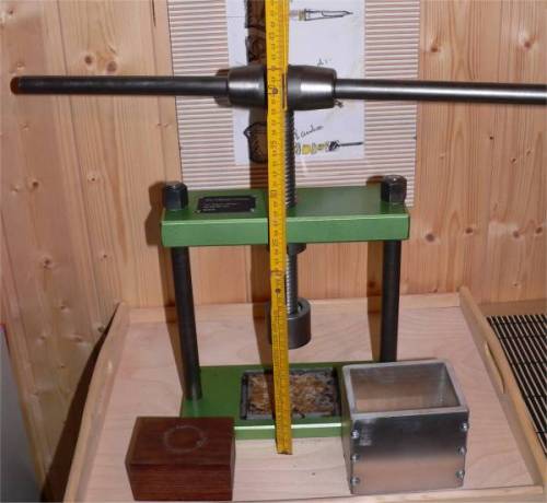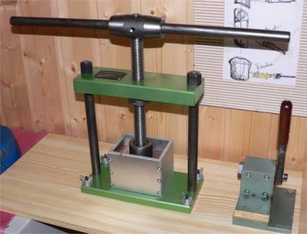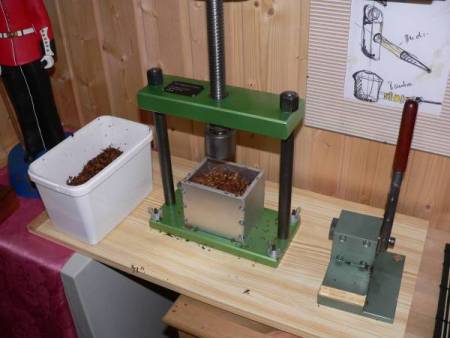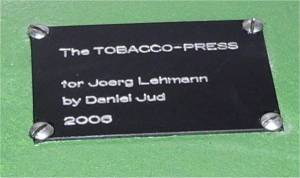 Der Arzt und Psychotherapeut Daniel Jud aus der Schweiz, der wegen seiner extrem präzisen Pfeifen bekannt ist, ist auch ein begnadeter Maschinenbauer und Werkzeugmacher. Schon vor einigen Jahren hat er auf meinen Wunsch hin einen Plug-Cutter entwickelt und gebaut, der sich inzwischen schon sehr großer Beliebtheit erfreut und auch weiterentwickelt wurde. Als Daniel wieder einmal "etwas in Metall" machen wollte, habe ich ihm den Vorschlag gemacht, es doch einmal mit einer Tabak-Presse zu versuchen. Das Ergebnis kann sich sehen lassen und vor allem funktioniert es tadellos. Das zwar nicht übertrieben große, aber immerhin 20 Kilogramm schwere Gerät ist ein Meisterstück der Präzision. Die Presse erzeugt, wenn man sie recht kräftig anzieht, einen Druck von ca. 4 t, wie Daniel und ich mit einer Kraftmessdose geprüft haben und hält diesen Druck über Tage.