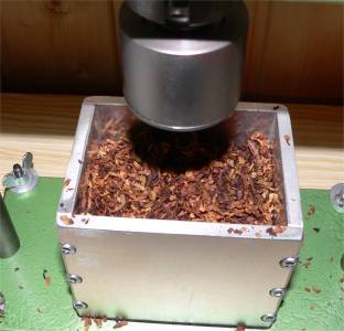 Der Tabak, der hier abgebildet wurde, war allerdings nur 4 Stunden in der Presse - ich bin immer noch am Probieren. Der Tabakblock stammt aus einem vorherigen Pressversuch, was die Farbunterschiede zwischen dem "eingefüllten" Tabak und dem Resultat erklären mag. Es handelt sich hierbei um eine handelsüblicheTabakmischung.