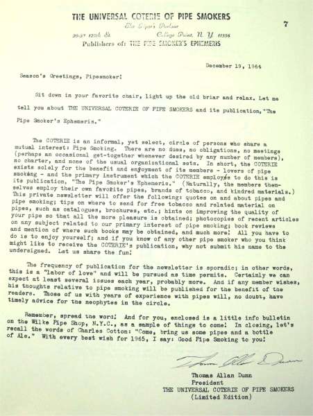 Es gibt wenige Pfeifenenthusiasten außerhalb der Zunft der Pfeifenmacher, die sich mit Ihrem Lebenswerk selbst ein Denkmal gesetzt haben wie Tom A. Dunn. Als Tom Dunn starb, hinterließ er die Ergebnisse einer über vierzig Jahre währenden publizistischen Tätigkeit zum Thema Pfeife und Tabak. Im Dezember 1964 versandte er die erste Ausgabe seiner "THE PIPE SMOKER´S EPHEMERIS". Was war und ist das besondere an dieser Idee? Tom Dunn wollte ein Medium zu Kommunikation, zur Diskussion und zum Erfahrungsaustausch Gleichgesinnter schaffen. Er hat nicht nur die Idee gehabt -so etwas mögen viele Pfeifenfreunde gehabt haben- er hat sie umgesetzt und dabei eine immense Arbeit investiert. Man kann die Arbeit heute wohl am Besten würdigen, wenn man sich die einzelnen Publikationen anschaut. In einer Zeit, in der PC und Scanner, Textverarbeitung und Grafikprogramme unbekannt waren, hat Tom Dunn seine Publikationen mit der Schreibmaschine geschrieben, Bilder und Skizzen, Cartoons und Faksimiles per Hand eingefügt, die fertigen Heftchen vervielfältigt und verschickt. Auch wenn das Layout aus heutiger Sicht rührend und ein wenig hausbacken erscheint, es steckt eine gewaltige Arbeit dahinter, die man nicht genug würdigen kann. Selbstverständlich hat Tom Dunn viele Ehrungen erfahren, die er in der Regel aber niemals persönlich entgegennahm, wie er allgemein in der Öffentlichkeit kaum aufgetreten ist.