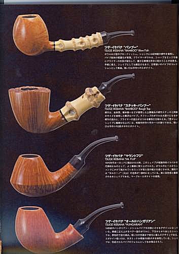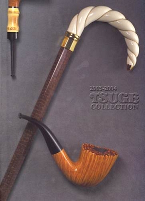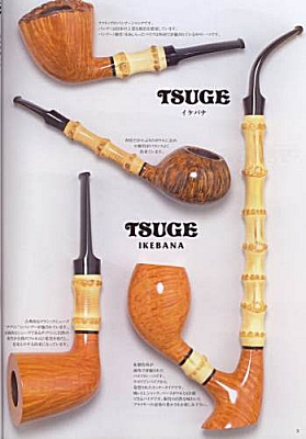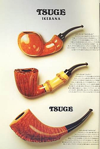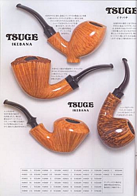 Die Kataloge sind vom Design und Format her den aktuellen DanPipe-Kataloge sehr ähnlich und ca. 150 Seiten stark. Die Kataloge beginnen immer mit den "Ikebanas", dann folgen die weiteren Serien der Marke Tsuge, dann andere Pfeifen, Tabake und Zubehör. Von Tsuge gibt es elegante Spazierstöcke und sehr edle Füllfederhalter. Zwei Dinge sind bemerkenswert. Die "Ikebana - Grades" gehen von "A" (25.000.- Yen) bis "V" (1.000.000.- Yen). Zum Vergleich: Die "normalen" Tsuges kosten zwischen 8.000.- und 15.000.- Yen. Im Katalog von 2007 sind auch die Tabakdosen und -beutel erstmals mit einem Warnhinweis ausgestattet, was in Anbetracht der verwendeten Schriftzeichen ziemlich lustig ausschaut.