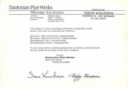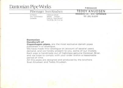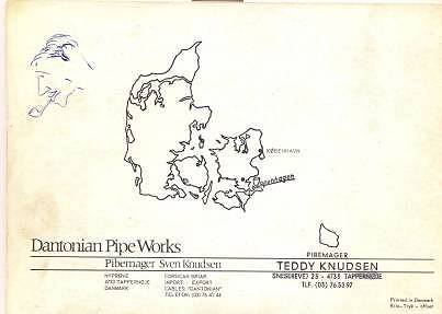 Diesen kleinen, alten Katalog schenkte mir Tom Eltang. Vermutlich stammt er aus den 1970ger Jahren. Sven Knudsen war Werkstattleiter bei W.O. Larsen bevor er in die Selbständigkeit ging. Sein Nachfolger wurde Former, bei dem dann Teddy Knudsen zum Pfeifenmacher ausgebildet wurde. Der Katalog zeigt einige Modelle der beiden Brüder, die unter der Marke "Dantonian" eine Zeit lang zusammengearbeitet haben.