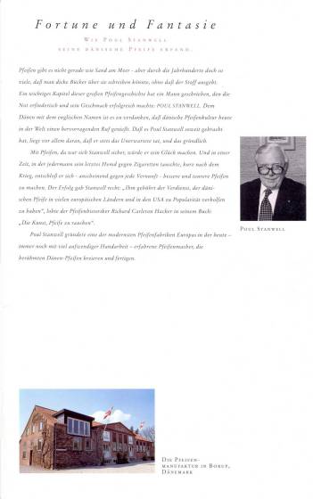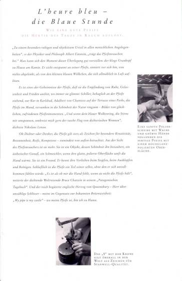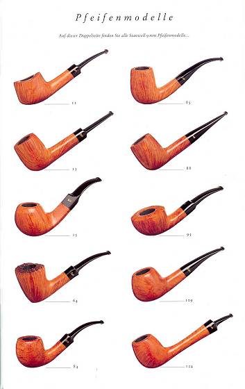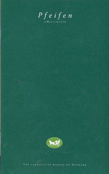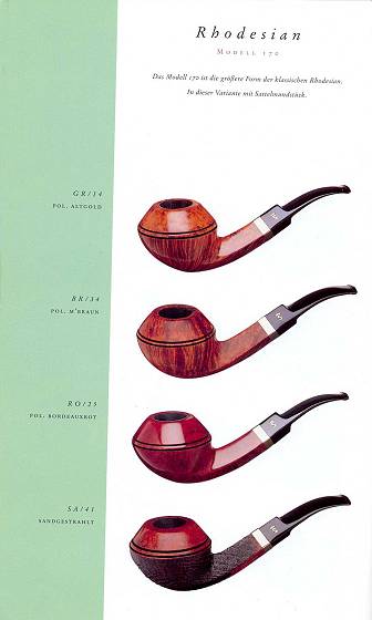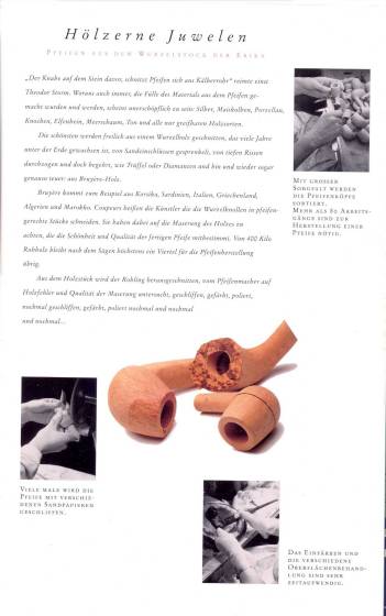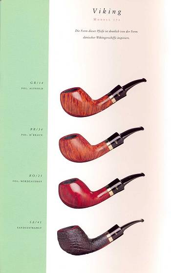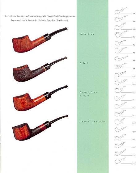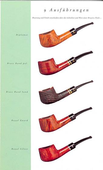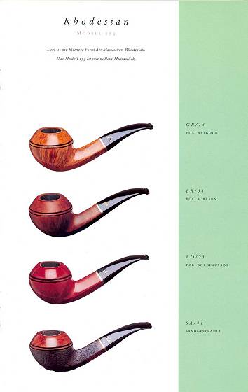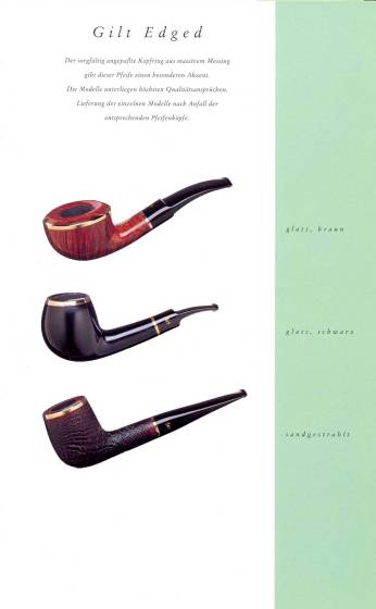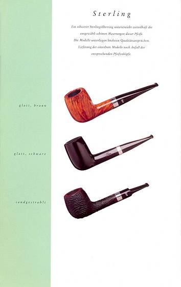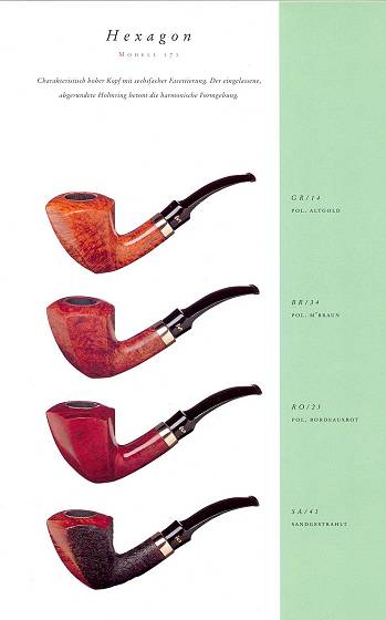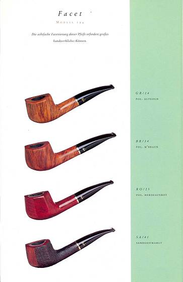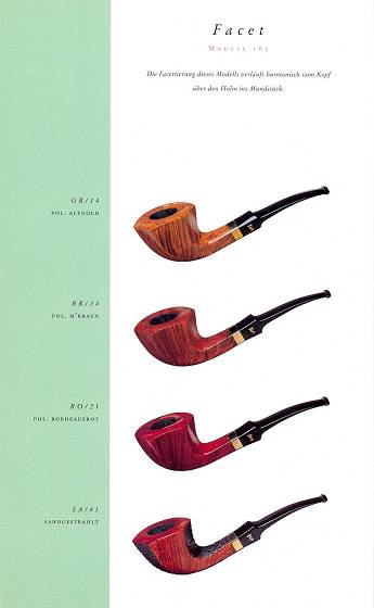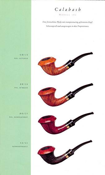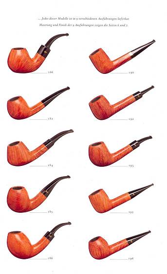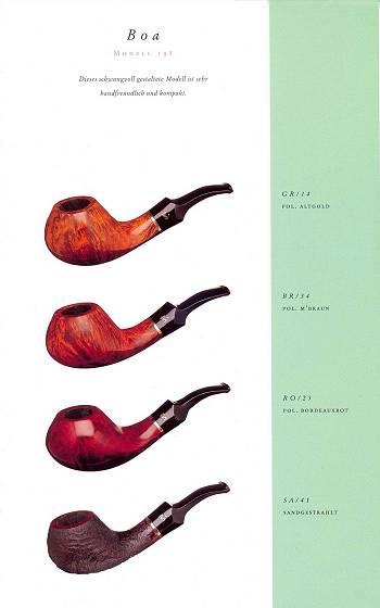 Dieser schönen Katalog (27 x 17 cm) stammt vom Ende der 1990er Jahre. Er zeigt ausschließlich Pfeifen mit 9mm-Filterbohrung. Interessant ist der Vergleich der damals angebotenen 9 finishes.